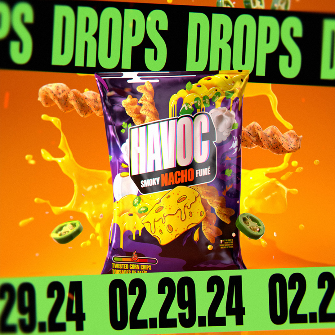For the launch of Havoc’s first three flavors, we created a set of 3D spots built entirely around bold sensory impact. Each film visualizes its flavor through vivid bursts of ingredients swirling in dynamic motion. Lime snaps, cheese erupts, and textures collide to form a mind blowing expression of taste brought to life with high energy animation.