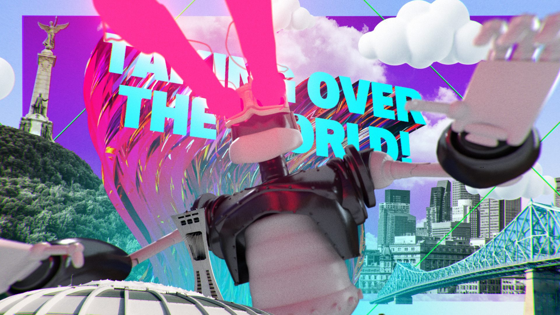 For Montreal International, AI Takeover, we created a fast paced mixed media film designed to attract world class companies and talent to the city. Blending live action, footage, 3D, 2D, bold typography and illustrative transitions, the piece mixes an edgy visual language with abstract tech cues that echo Montreal’s leadership in AI. The result is a cheeky energetic portrait of a city where innovation and quality of life collide.